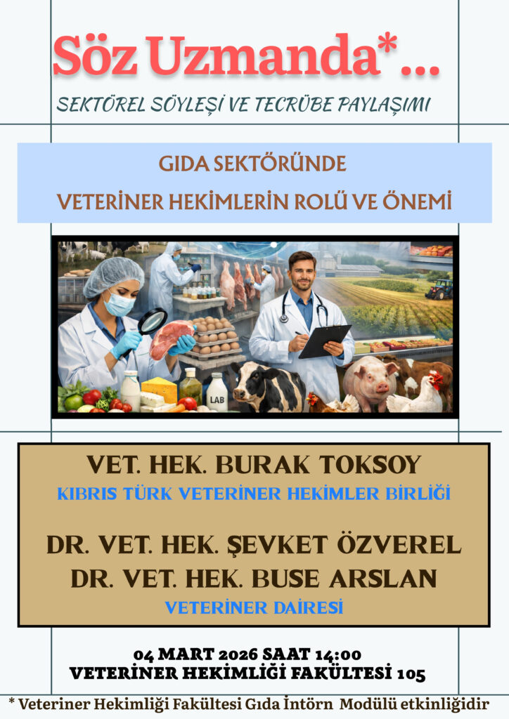 Veteriner Hekimliği Fakültesi Gıda İntörn Modülü kapsamında düzenlenen “Söz Uzmanda: Sektörel Söyleşi ve Tecrübe Paylaşımı” etkinlik serisinin ikinci programı, 04 Mart 2026 tarihinde saat 14.00’te Fakültemiz 105 nolu salonda yoğun katılımla gerçekleştirildi. Etkinliğin bu haftaki teması “Gıda Sektöründe Veteriner Hekimlerin Rolü ve Önemi” olurken, Kıbrıs Türk Veteriner Hekimler Birliği adına Burak Toksoy, Şevket Özverel ve Buse Arslan öğrencilerimizle bir araya gelerek bilgi ve deneyimlerini paylaştı ve gıda sektöründe veteriner hekimliğin kritik rolünü çok yönlü bir bakış açısıyla ele aldı.