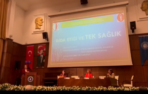Prof. Dr. Dilek Arsoy, insan, hayvan, bitki ve çevre sağlığının birbiriyle sıkı sıkıya bağlı olduğunu vurgulayan “Tek Sağlık” ilkesinin, sağlıklı toplumların temelini oluşturduğunu belirtti. Bu ilke, hayvan ve insan sağlığı bilgilerinin entegrasyonunu ve paylaşımını, verimli sağlık sistemlerinin anahtarı olarak görüyor. Prof. Arsoy, bu yaklaşımın aynı zamanda Gıda Etiği ile de yakından ilişkili olduğunu ifade etti. Gıda Etiği, besin maddelerinin sadece sağlıklı ve besleyici olmasının ötesinde, adaletsiz uygulamaları içermeyen, hayvan ve bitki refahına uygun, güvenli ve güvenilir kaynaklardan elde edilmesi gerektiğini vurguluyor.